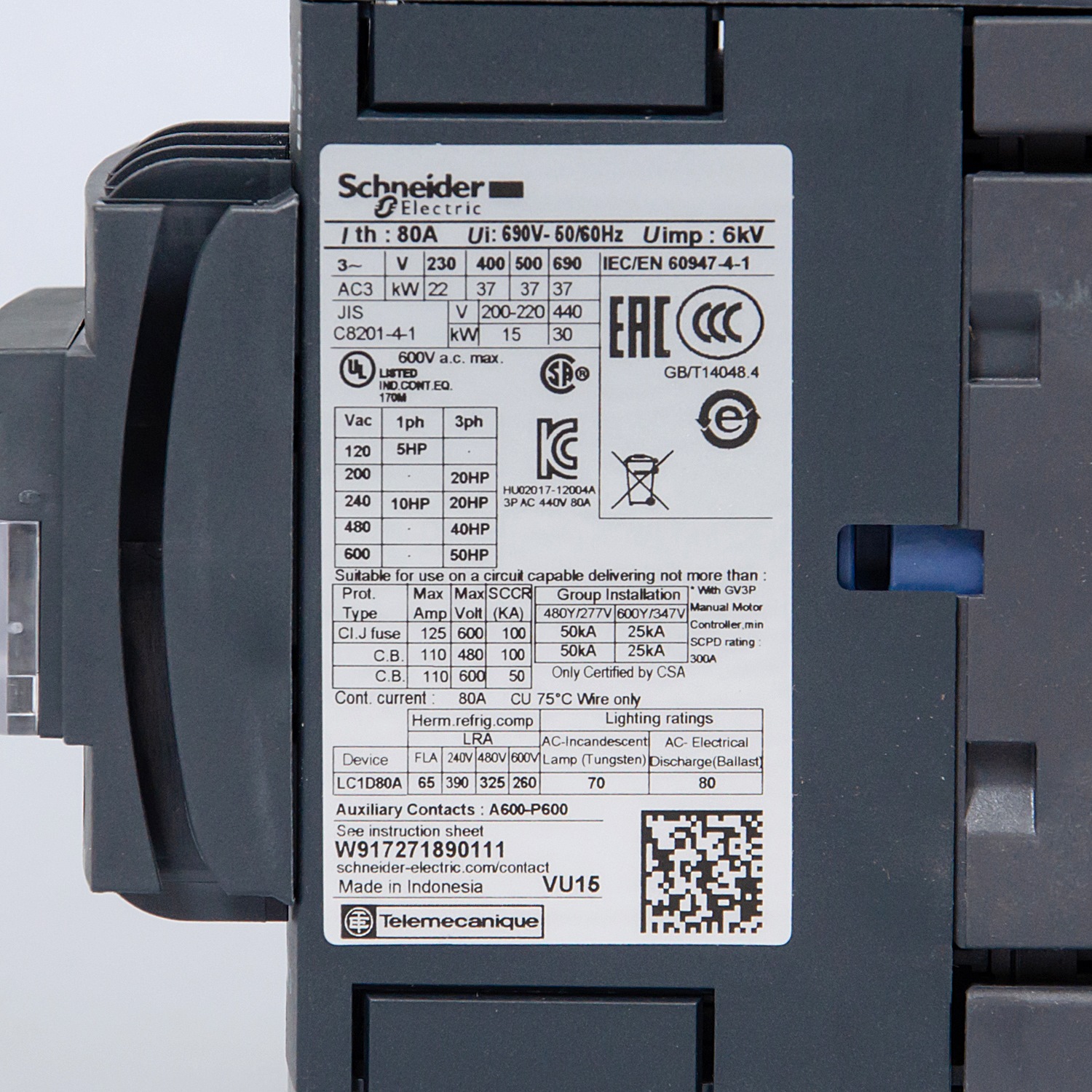 LC1D80AM7 | Контактор, серия Tesys D, 3P, 80 А, AC3, 1 НО +1 НЗ, 220В AC, Everlink, Schneider Electric