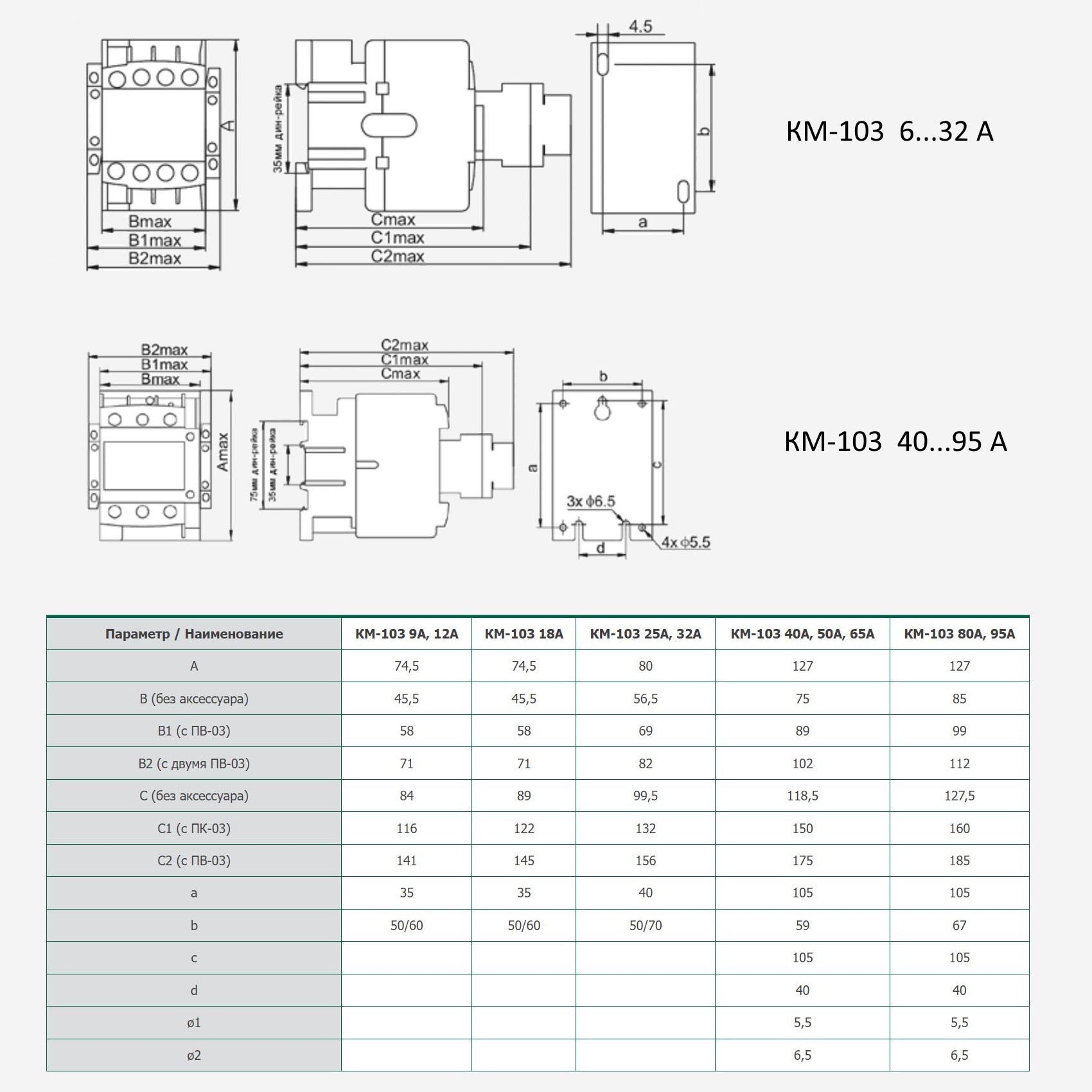 Контакторы КМ-103 DEKraft выпускаются в двух форм-факторах, которые охватывают диапазон токов от 9 до 95 А и от 115 до 630 А. Номинальное напряжение 690 В