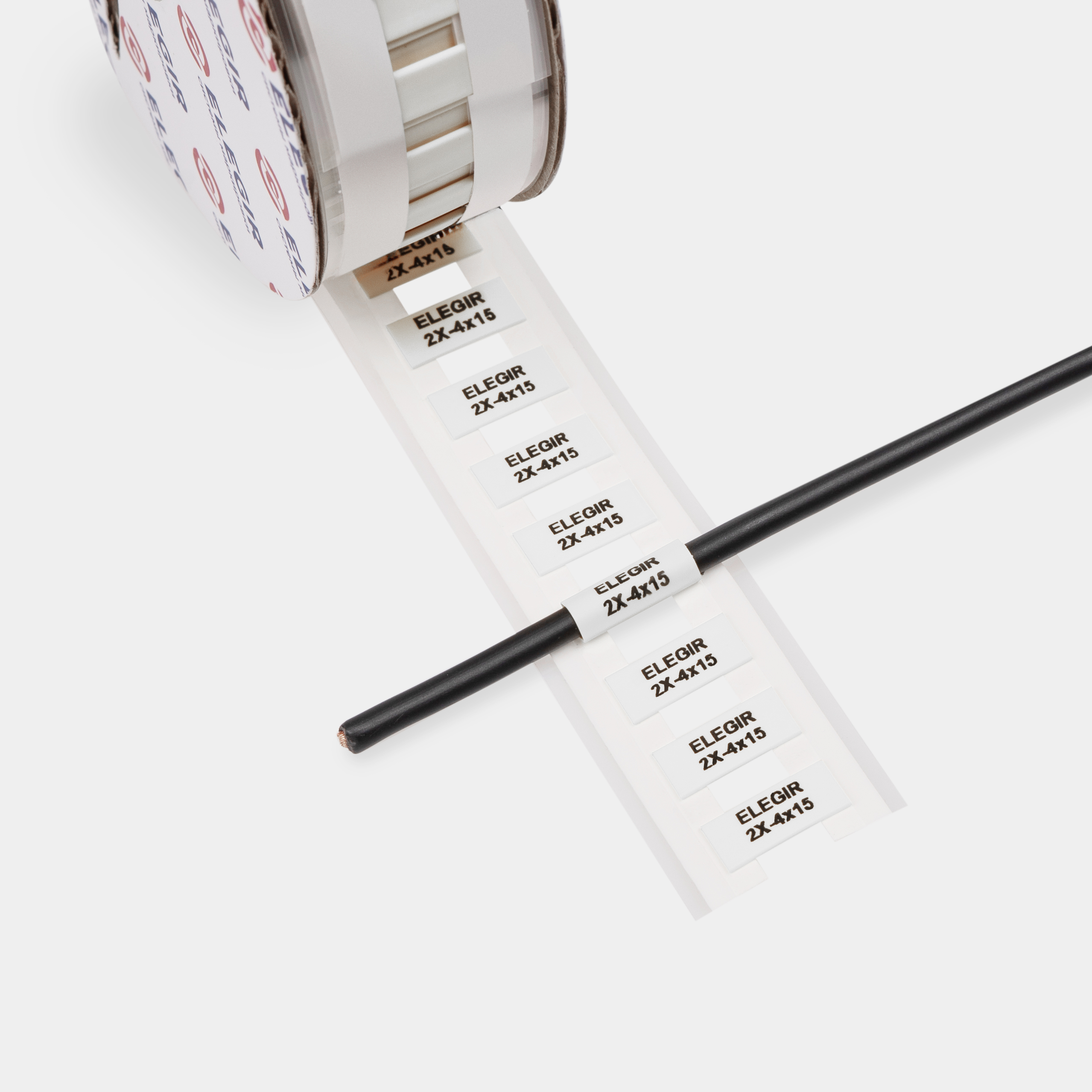 Маркер термоусадочный MFSS - это плоский полиолефиновый кембрик на клейкой ПЭТ-подложке для термотрансферной печати с возможностью термоусадки. Маркер термоусадочный MFSS-2X-4-15-W предназначен для маркировки провода Ø 4/2 мм (0,5 — 2,5 мм²)