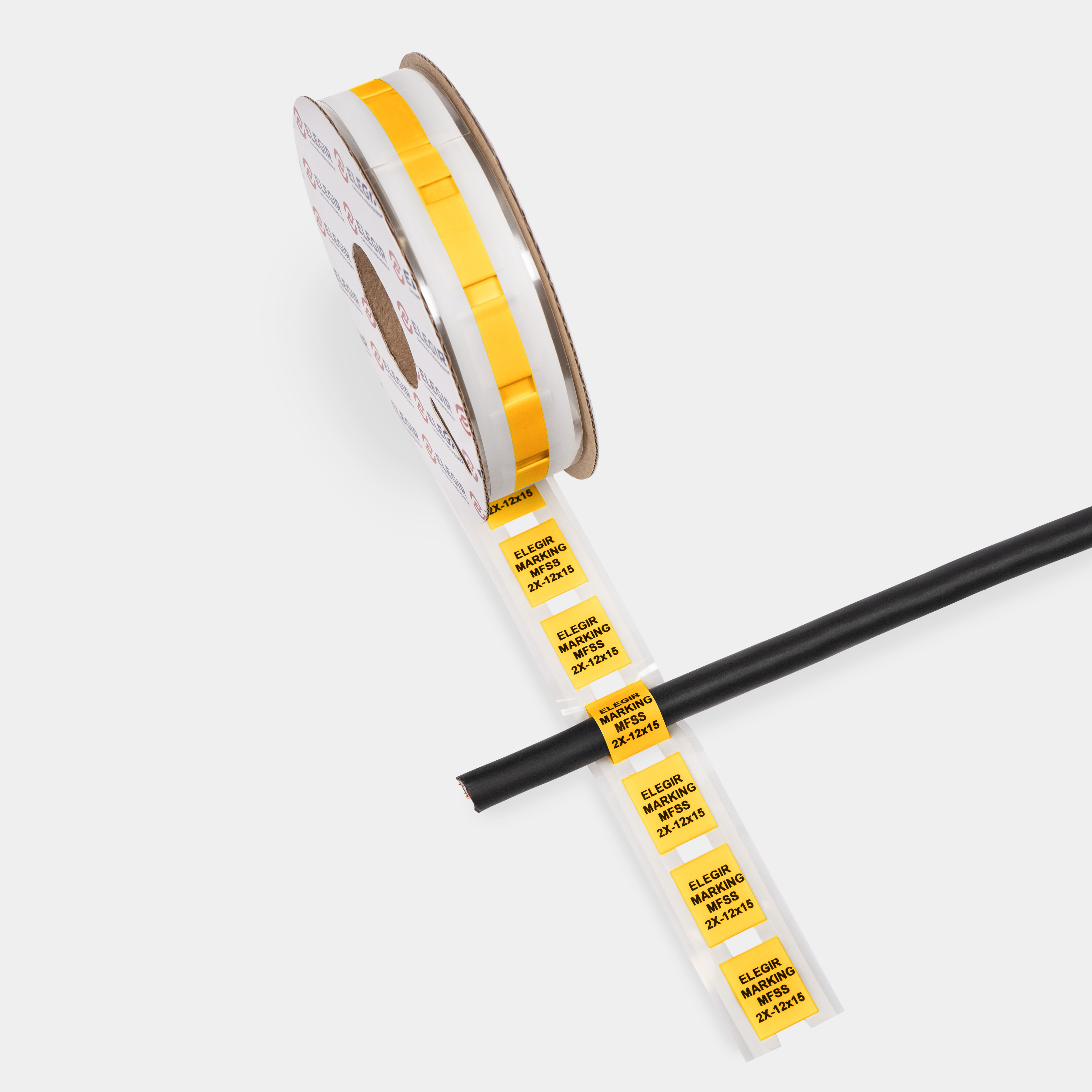 Маркер термоусадочный MFSS Elegir - это плоский полиолефиновый кембрик на клейкой ПЭТ-подложке для термотрансферной печати с возможностью термоусадки