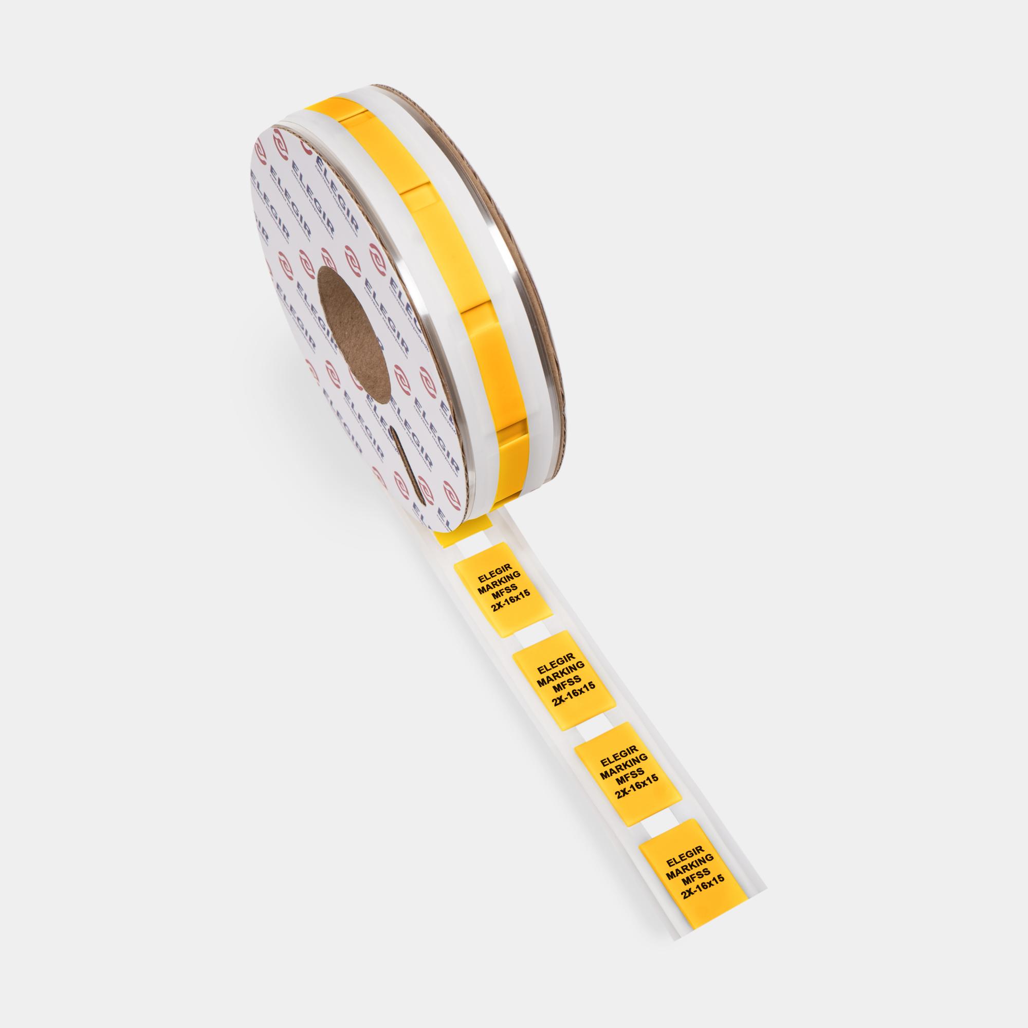 Маркер термоусадочный MFSS Elegir - это плоский полиолефиновый кембрик на клейкой ПЭТ-подложке для термотрансферной печати с возможностью термоусадки