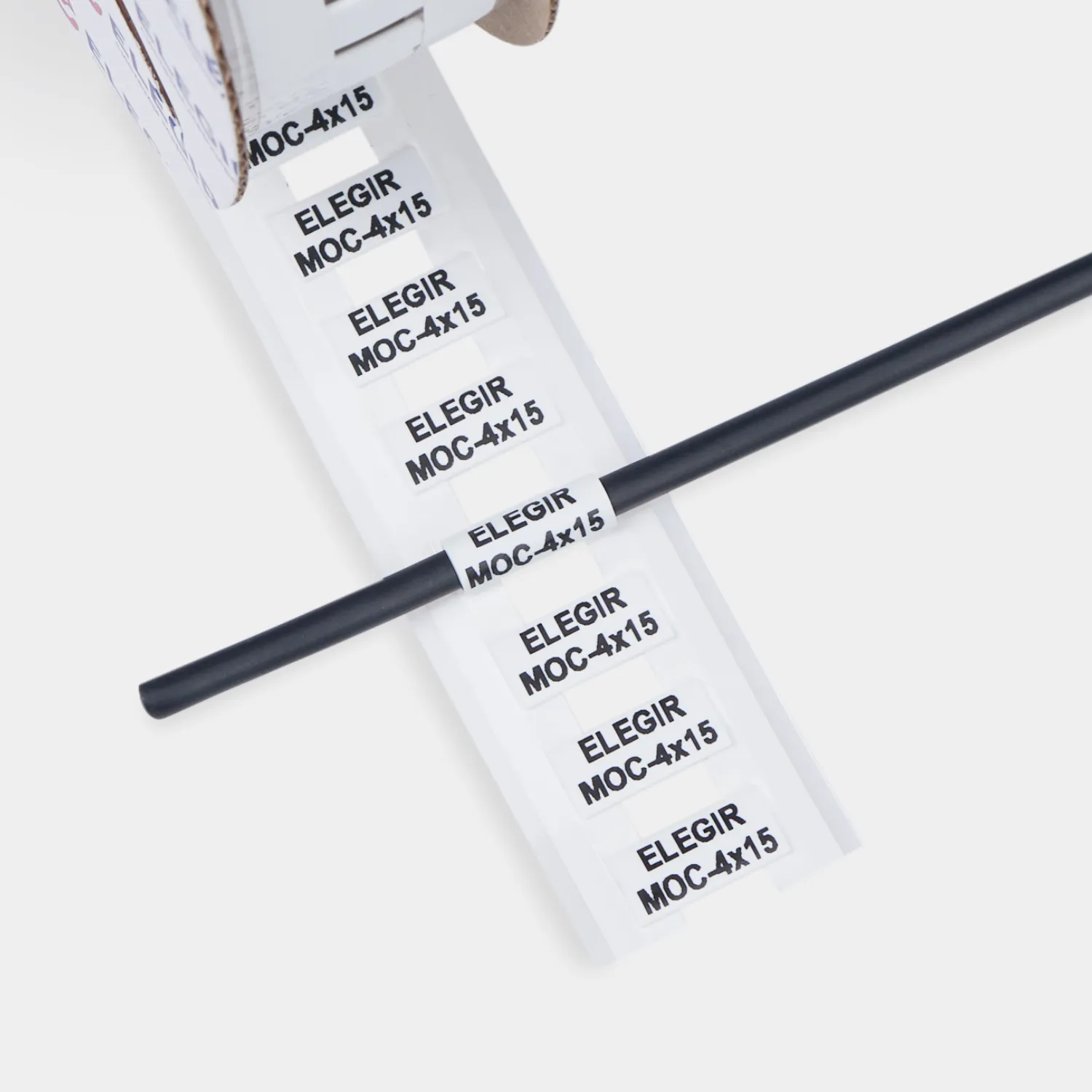 Маркер овальный MOC-4-15-W Elegir — это лента с поливинилхлоридными кембриками на клейкой ПЭТ-подложке для термотрансферной печати без возможности термоусадки
