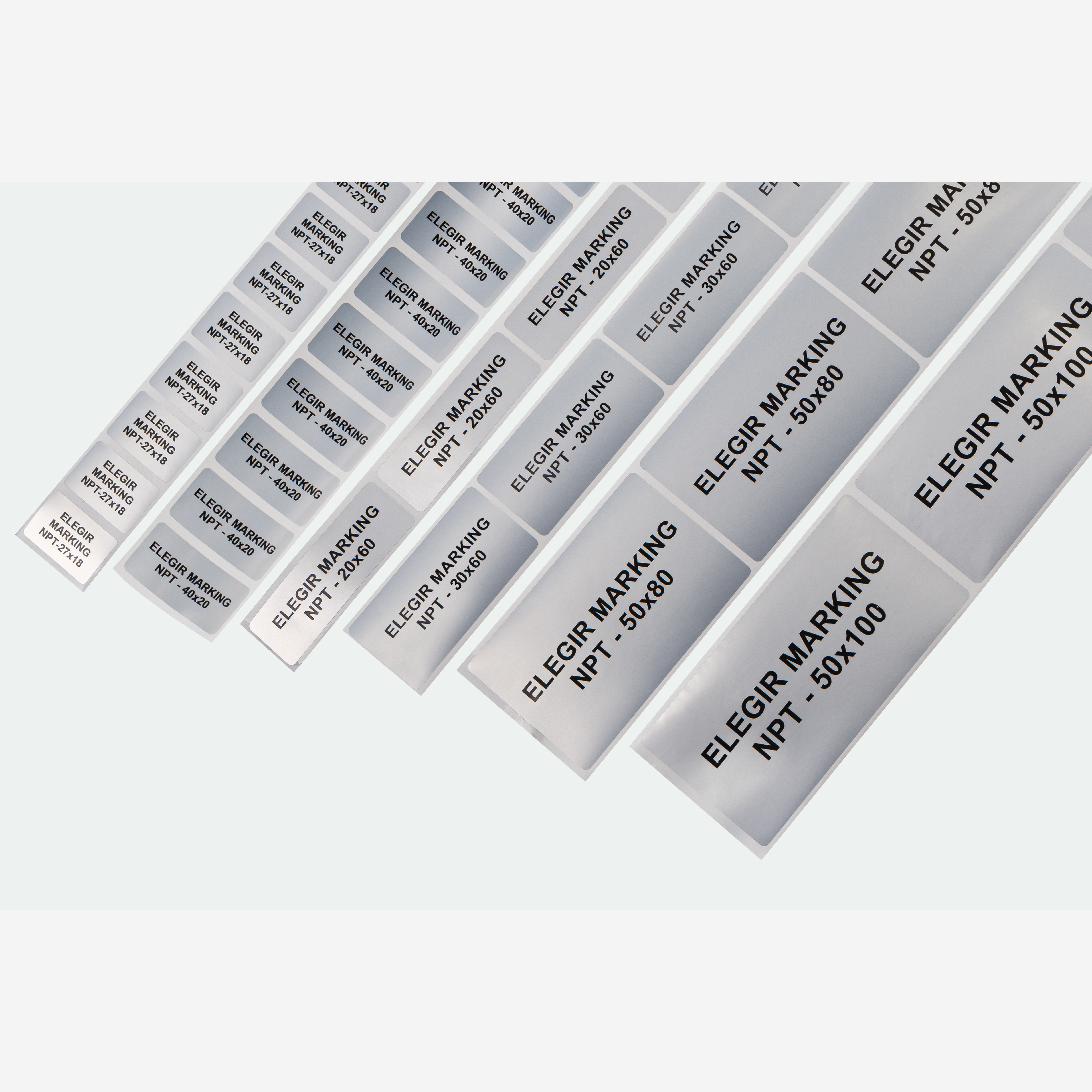 Металлизированная наклейка NPT - это матовая металлизированная полиэстровая пленка для термотрансферной печати с усиленным морозостойким акриловым клемм. NPT-40х20 предназначена для маркировки электрических шкафов и навесных электрических элементов. Имеют высокую стойкость к УФ-излучению, истиранию и царапинам