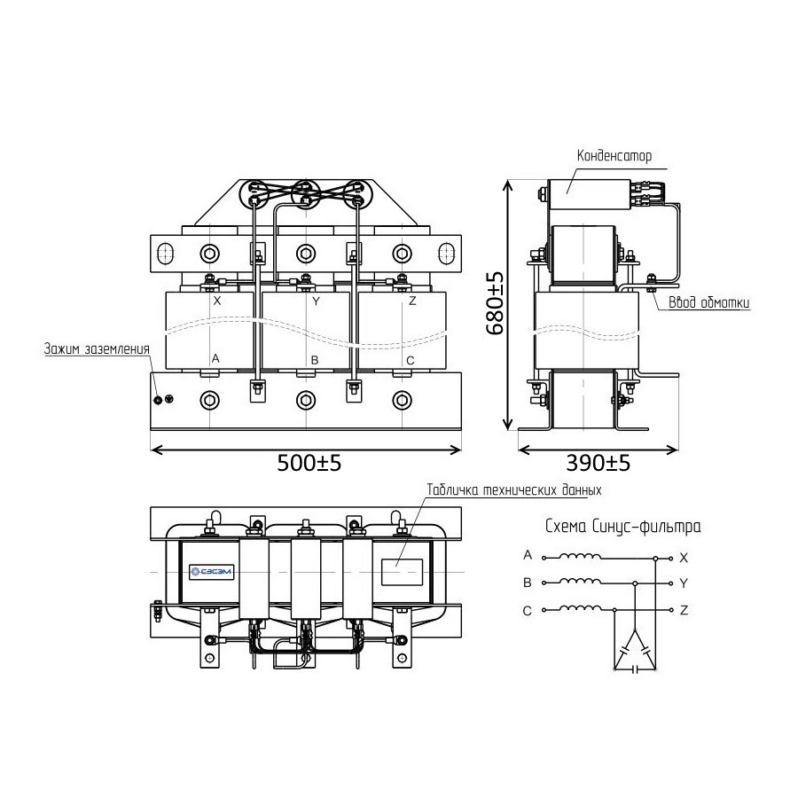 Синусный фильтр устанавливается между преобразователем частоты и двигателем. Представляет собой трехфазную катушку индуктивности на магнитном сердечнике в комплекте с конденсаторами.