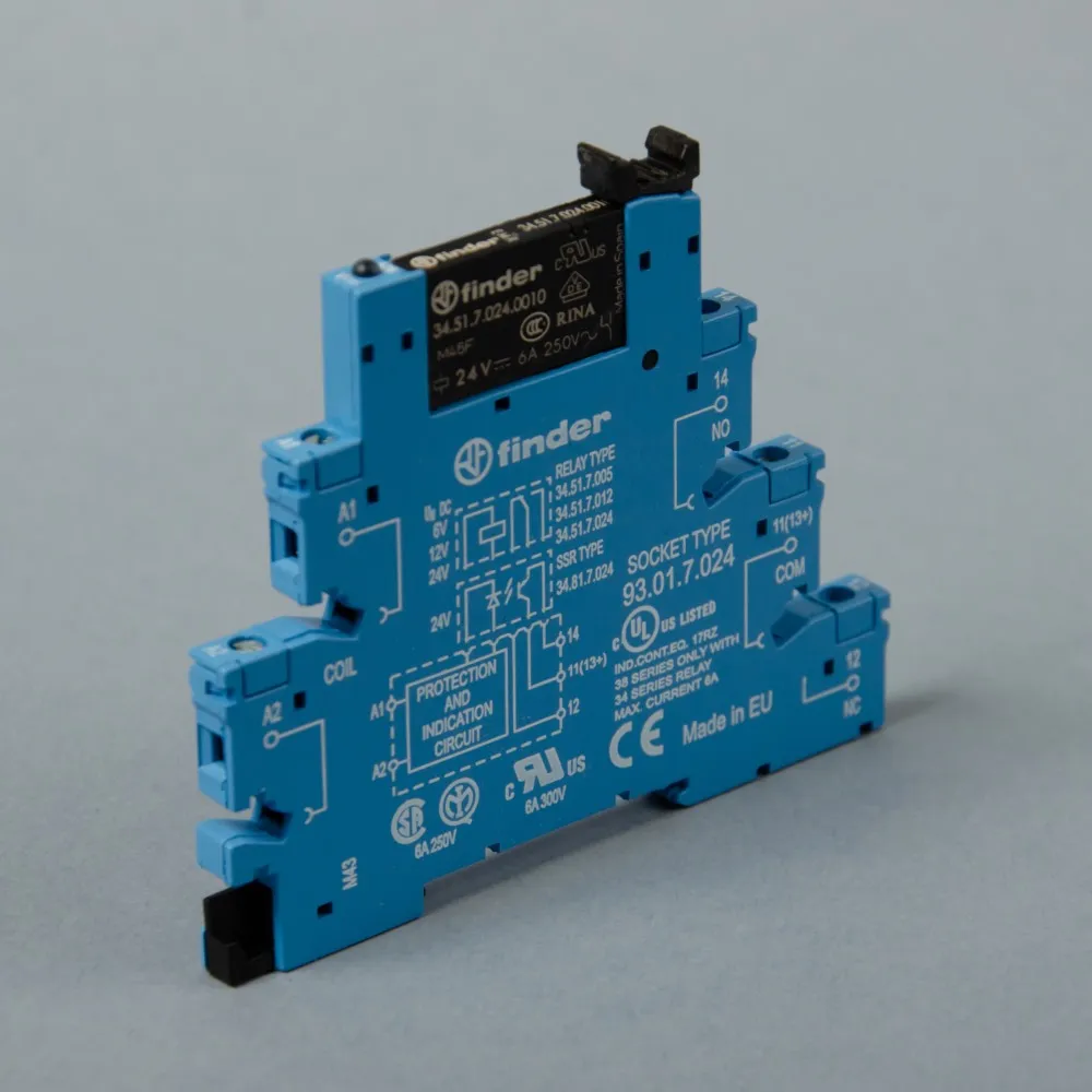 Модуль реле в сборе с розеткой и готовый к монтажу на DIN-рейку. Состоит из реле 345170240010 и розетки 93017024.
