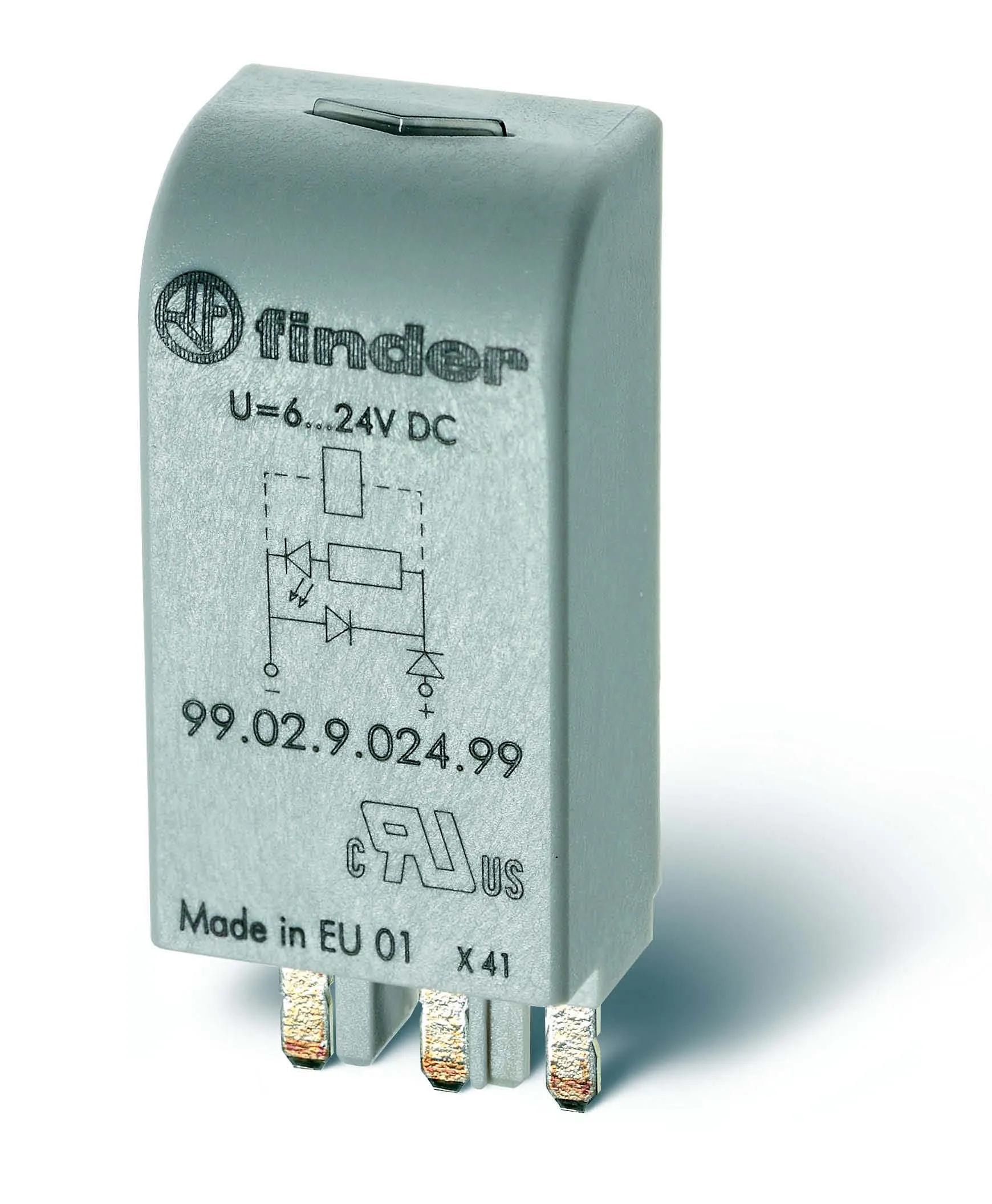 Показывает наличие напряжение на катушке и защищает транзисторные выходы ПЛК от напряжения обратной полярности. Модуль устанавливается в специально предназначенный для этого слот в розетке под реле. Состоит из 2 диодов и зелёного светодиода, который загорается при подаче напряжения на катушку.
