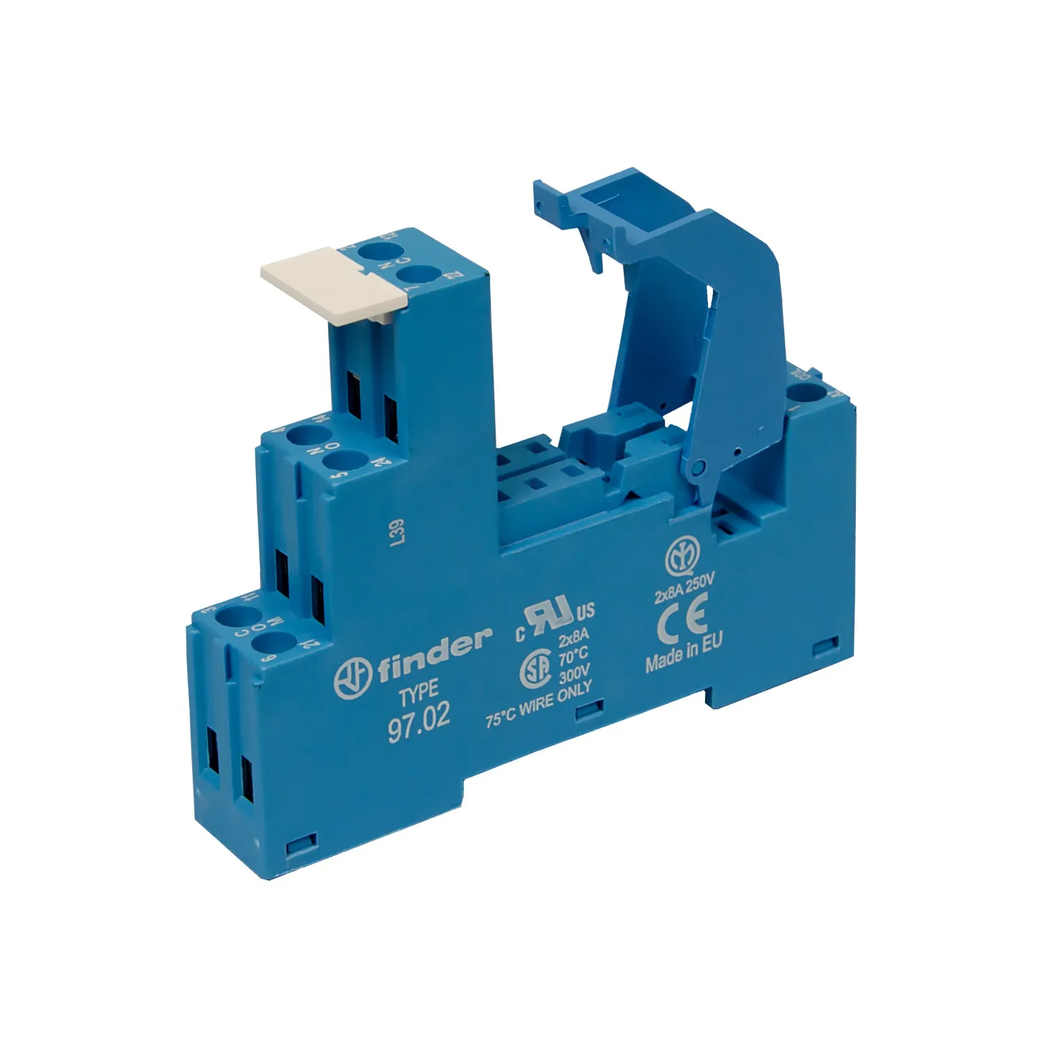 Пластиковая розетка синего цвета с винтовыми зажимами для реле Finder 46.52, применяются модули 86.30, 99.02.