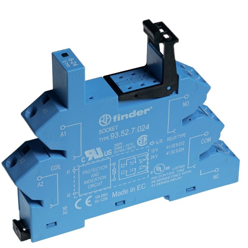 Пластиковая розетка синего цвета с пружинными зажимами для реле Finder 41 серии.