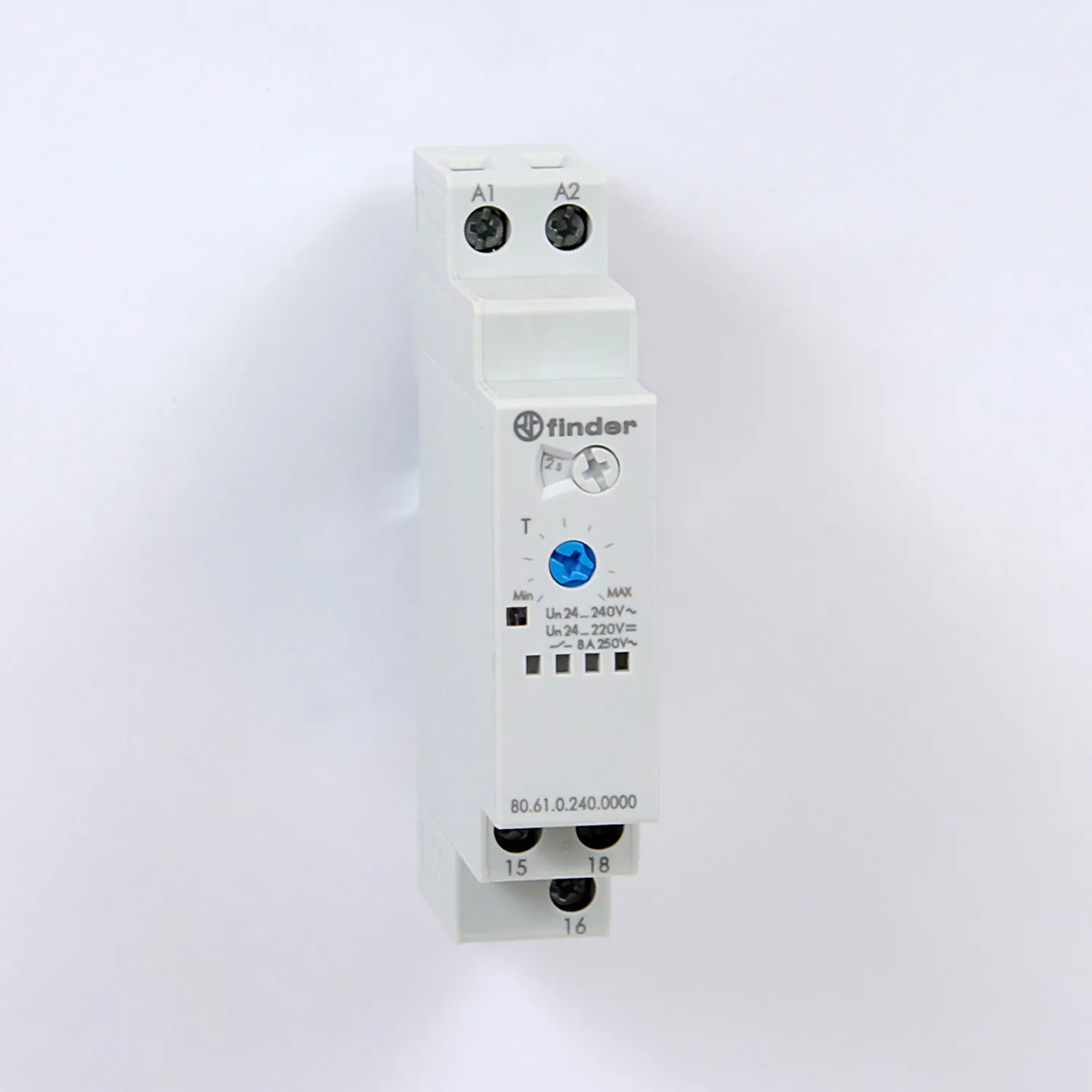 Модульный таймер Finder, серии 80. Серия включает реле с выдержкой времени от 0,1 секунды до 24 часов, 1 переключающим контактом 6, 8 или 16А категории AC-1.