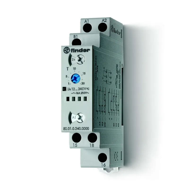 Модульный таймер Finder, серии 80. Серия включает реле с выдержкой времени от 0,1 секунды до 24 часов, 1 переключающим контактом 6, 8 или 16А категории AC-1.