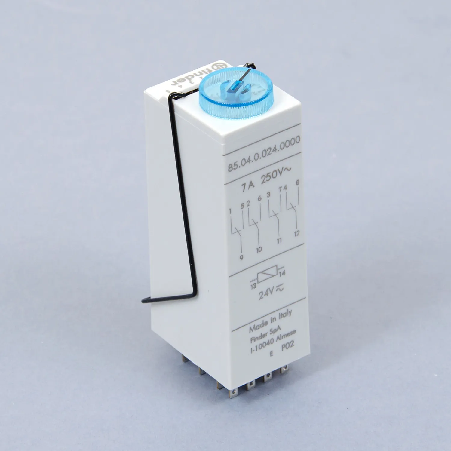 Таймер Finder, серии 85 для установки в розетки арт. 94.04. Серия включает реле с выдержкой времени от 0,05 секунд до 100 часов, двумя, тремя или четырьмя переключающим контактоми 7 или 10А категории AC-1.