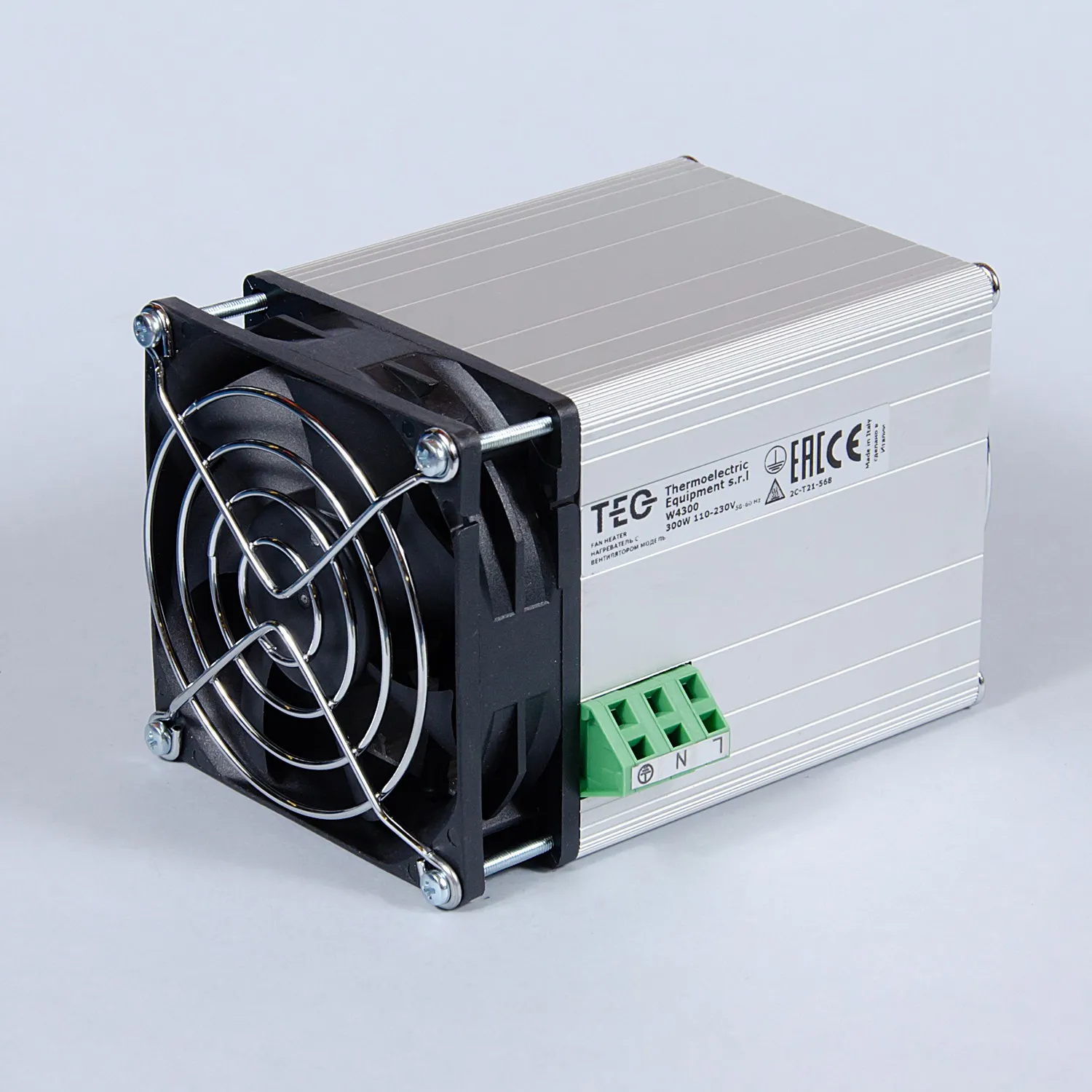 На торце обогревателя установлен вентилятор, который прогоняет холодный воздух через обогреватель. Этим обеспечивается циркуляция и равномерный нагрев воздуха внутри шкафа.