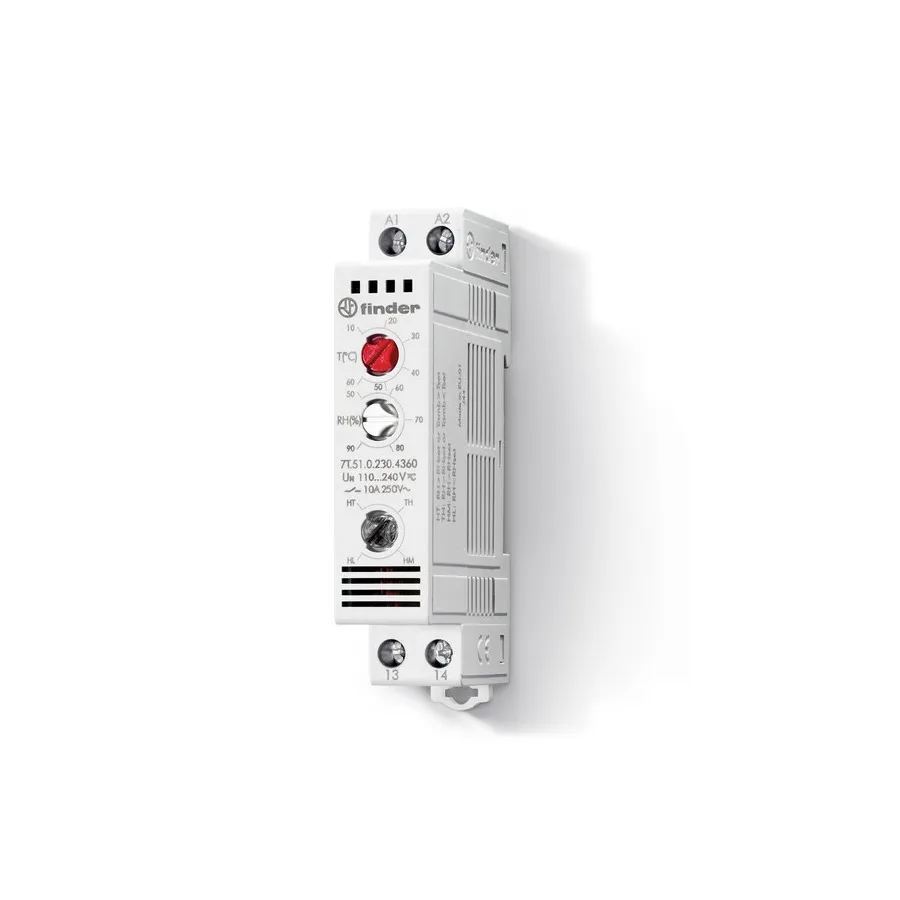 Применяется для автоматического поддержания температуры внутри шкафа и экономии моторесурса вентилятора. Устанавливается на DIN-рейку шириной 35 мм. Температура регулируется в пределах 0…+60°C. Встроенный Н.О контакт рассчитан на ток до 10А при 250В переменного тока.