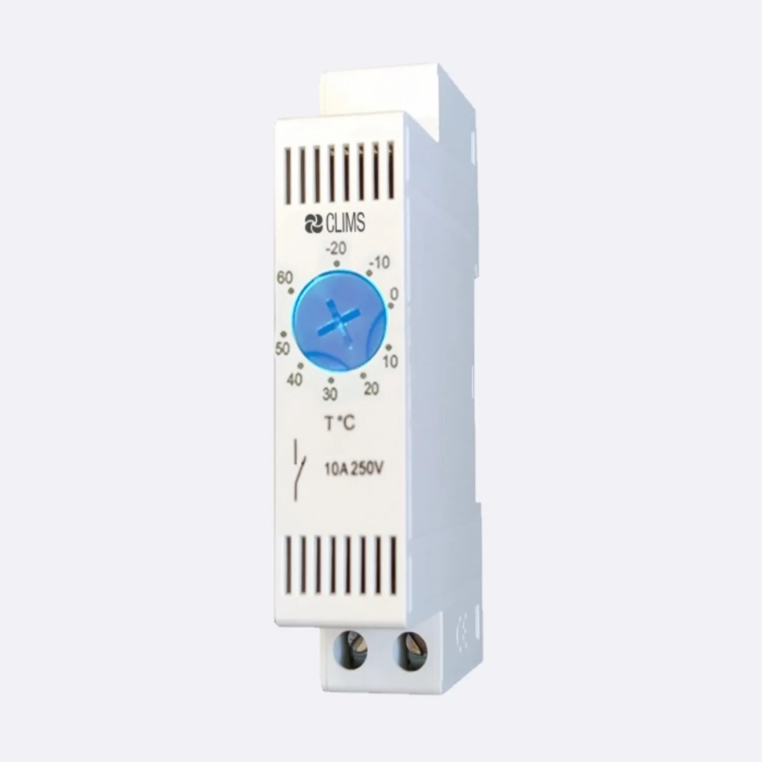 Применяется для автоматического поддержания температуры внутри шкафа и экономии моторесурса вентилятора. Устанавливается на DIN-рейку шириной 35 мм. Температура регулируется в пределах −20…+60°C. Встроенный Н.О контакт рассчитан на ток до 10А при 250В переменного тока.