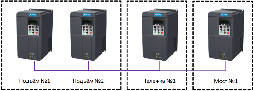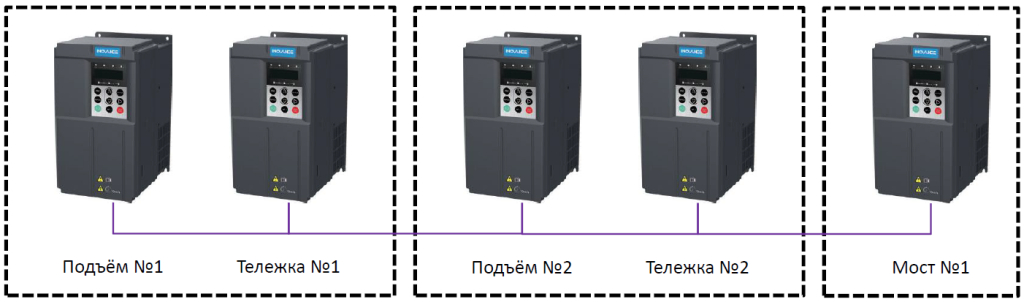 В любой из этих топологий ПЧ механизма подъема вычисляет текущую высоту подъема с помощью энкодера и передает её в ПЧ механизмов перемещения. Они в свою очередь изменяют рампы разгона/торможения в автоматическом режиме для нивелирования раскачки груза
