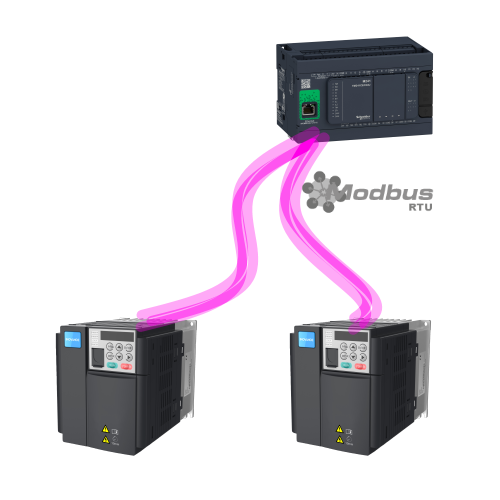 Для реализации управлением частотным преобразователем по протоколу ModBus нужно подключить его через сеть RS-485 к контроллеру и настроить оба устройства.