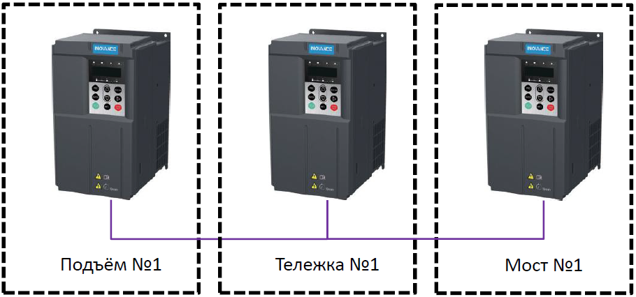 В любой из этих топологий ПЧ механизма подъема вычисляет текущую высоту подъема с помощью энкодера и передает её в ПЧ механизмов перемещения. Они в свою очередь изменяют рампы разгона/торможения в автоматическом режиме для нивелирования раскачки груза